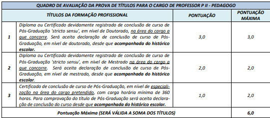 A prova de títulos será realizada considerando os títulos de formação acadêmica. A pontuação para a prova de títulos será realizada da seguinte forma: