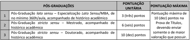 A prova de títulos será realizada considerando os títulos de formação acadêmica. A pontuação para a prova de títulos será realizada da seguinte forma: