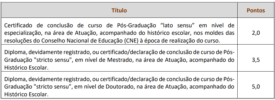 A prova de títulos será realizada considerando os títulos de formação acadêmica. A pontuação para a prova de títulos será realizada da seguinte forma: