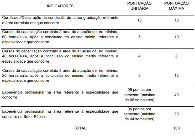 A avaliação levará em conta a formação acadêmica, cursos de capacitação na área, experiência profissional comprovada na rede pública e/ou privada, curso específico em Educação Especial e atuação prévia no setor público. Confira: