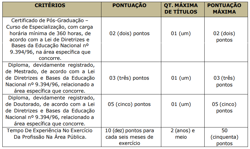 A prova de títulos será realizada considerando os títulos de formação acadêmica. A pontuação para a prova de títulos será realizada da seguinte forma: