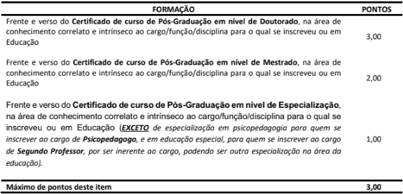 A prova de títulos será realizada considerando os títulos de formação acadêmica. A pontuação para a prova de títulos será realizada da seguinte forma: