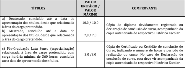 A prova de títulos será realizada considerando os títulos de formação acadêmica. A pontuação para a prova de títulos será realizada da seguinte forma: