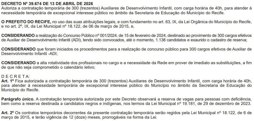 De acordo com as informações divulgadas, foram autorizadas 300 contratações temporárias, destinadas a Auxiliares de Desenvolvimento Infantil (ADI). A medida tem como objetivo suprir necessidades emergenciais da rede, garantindo o funcionamento adequado das atividades escolares.