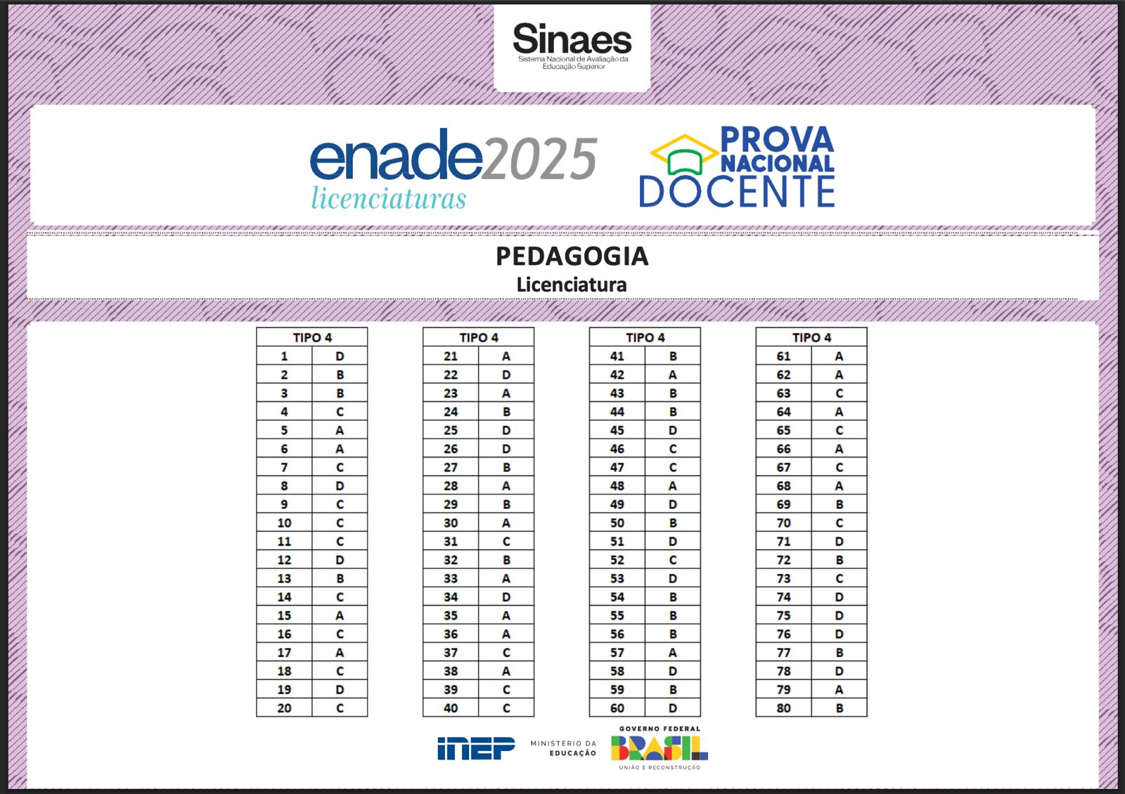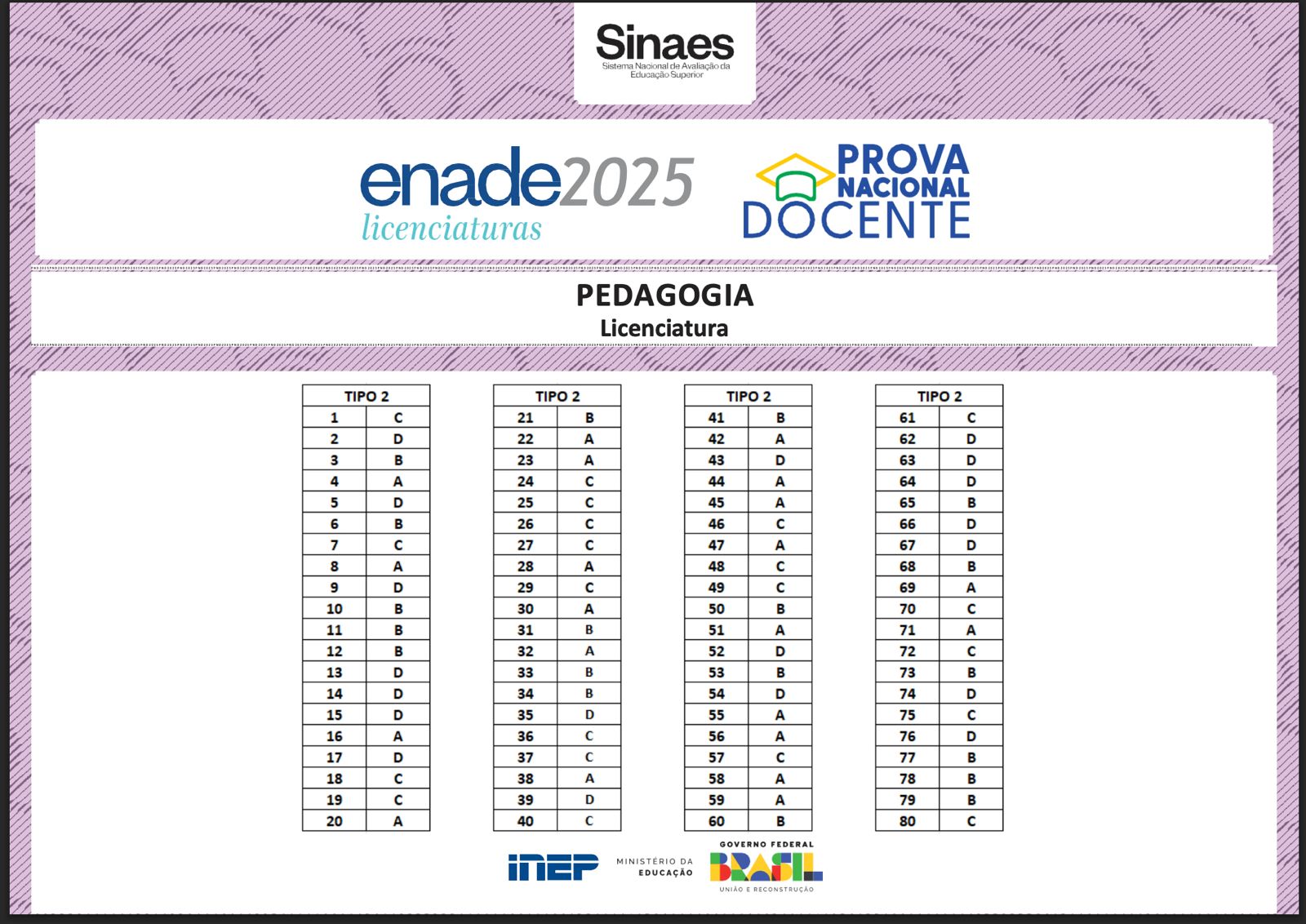 Após a aplicação das provas, os candidatos já podem conferir os gabaritos preliminares, divulgados no dia 28 de outubro de 2025, no site do Inep (www.gov.br/inep/). Os participantes poderão entrar com recurso contra o gabarito preliminar e o padrão de resposta entre os dias 28 e 29 de outubro de 2025, pelo Sistema PND (www.pnd.inep.gov.br).