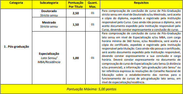 A prova de títulos será realizada considerando os títulos de formação acadêmica. A pontuação para a prova de títulos será realizada da seguinte forma: